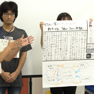 最終発表では、各チームが学んだスキルを活かして導き出した【問い】をもとに、「2035年に発行される未来新聞」を作成し、その内容をスキット形式で発表しました。