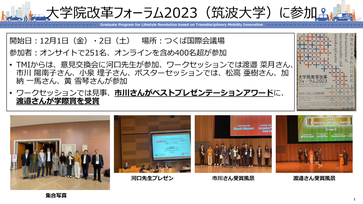12月1日(金)、2(土)つくば国際会議場で開催された大学院改革フォーラム2023(inつくば)に河口先生及びTMI履修生が参加いたしました。オンサイトで251名、オンラインを含め400名超が参加しました。