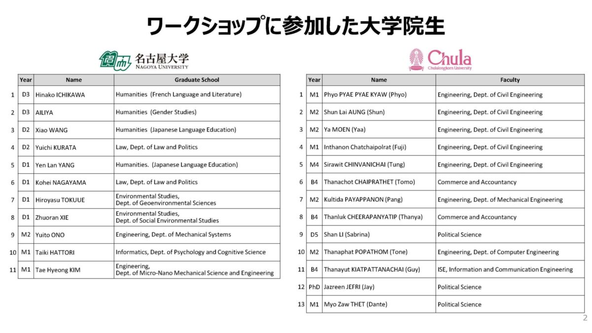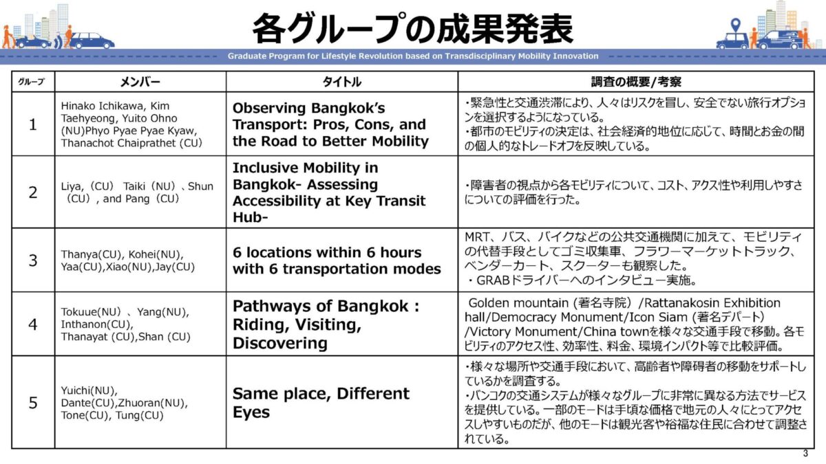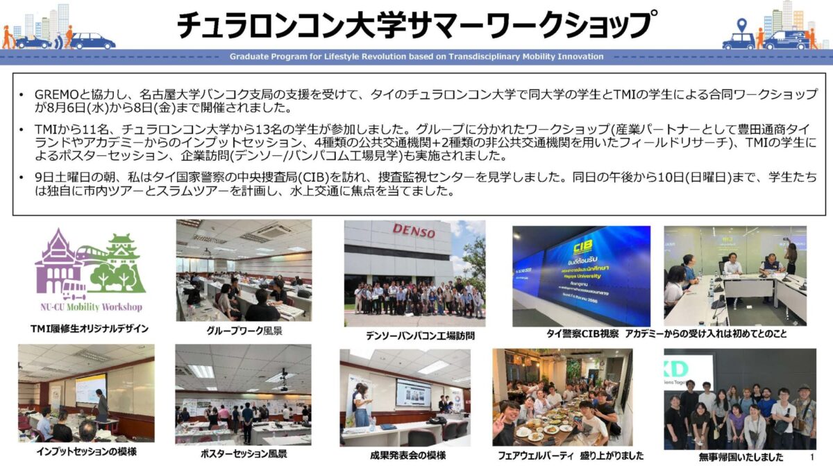 名古屋大学モビリティ社会研究所(GREMO)との連携により、名古屋大学バンコク事務所の支援を得て、タイ・チュラロンコン大学において同大学学生とTMI履修生による合同ワークショップを2025年8月6日(水)~8日(金)の日程で開催しました。