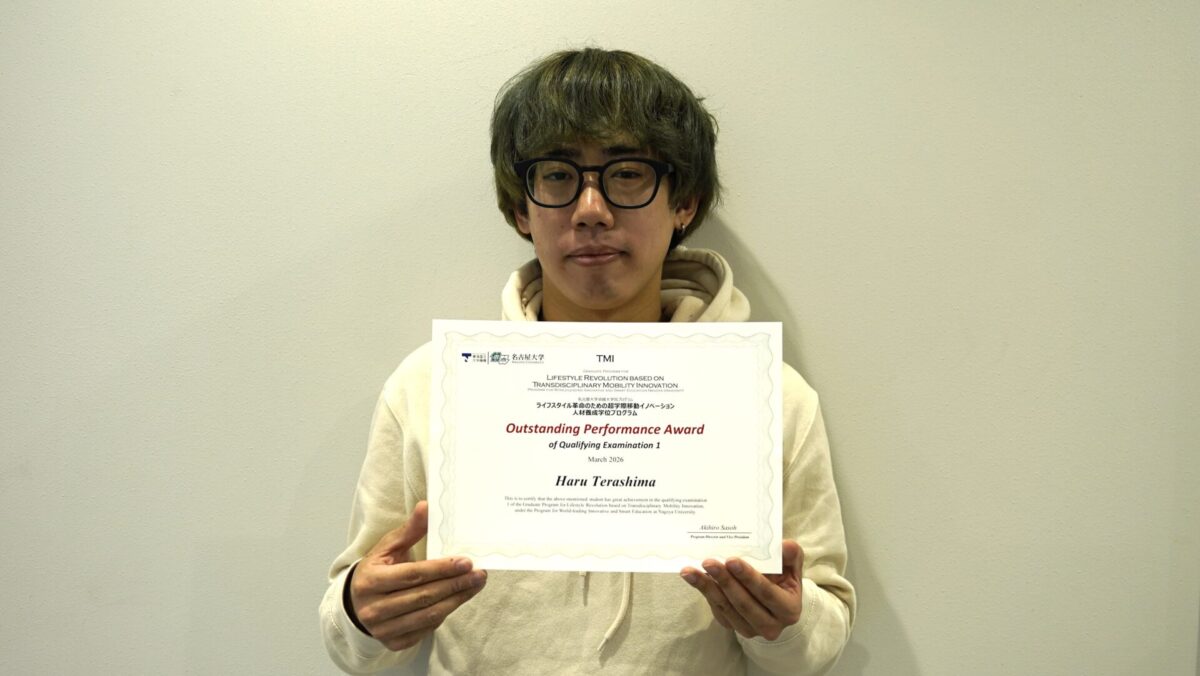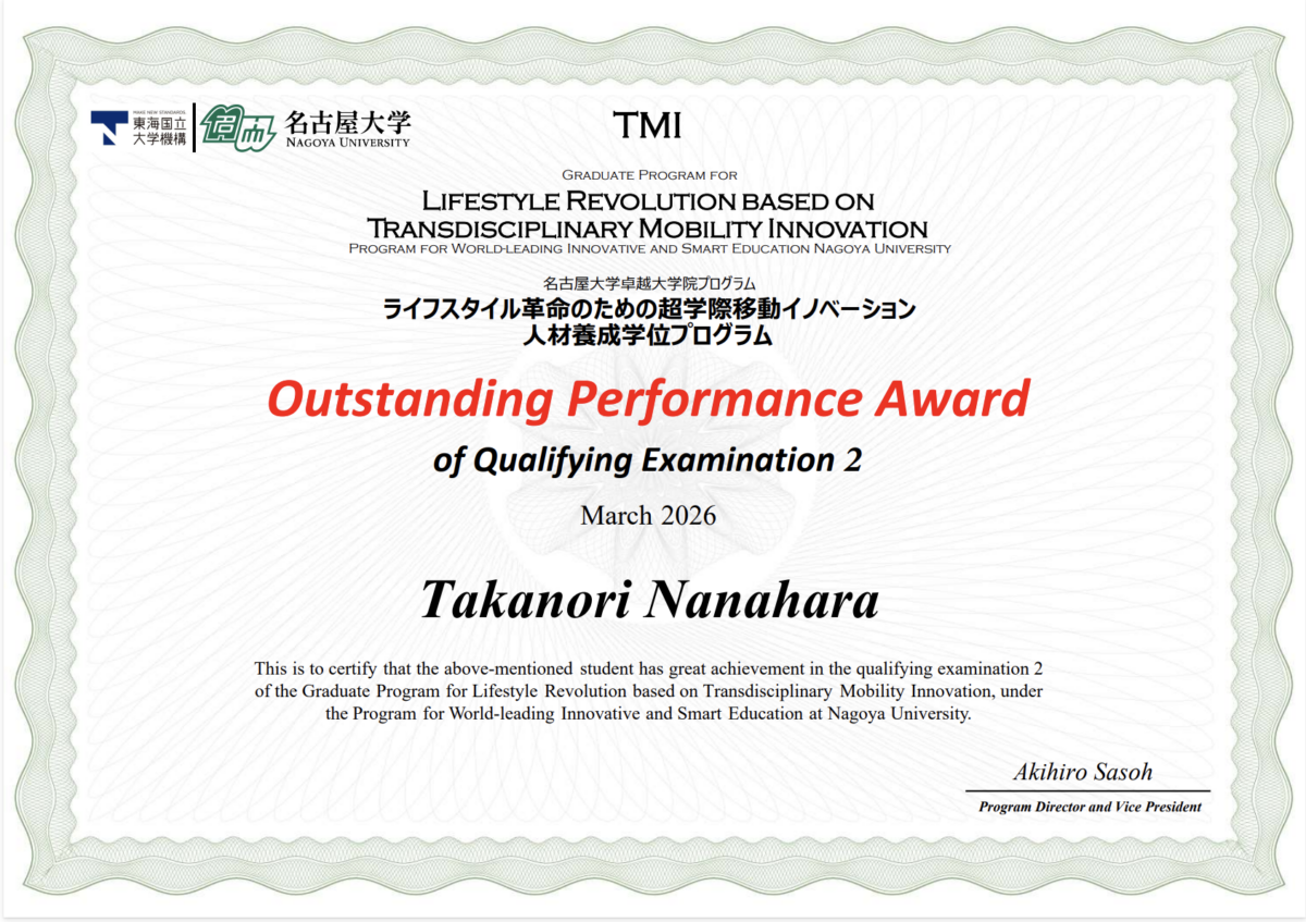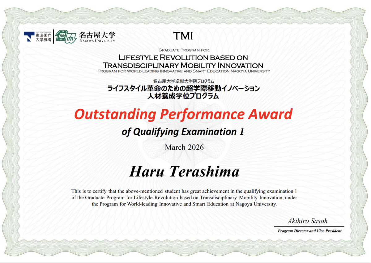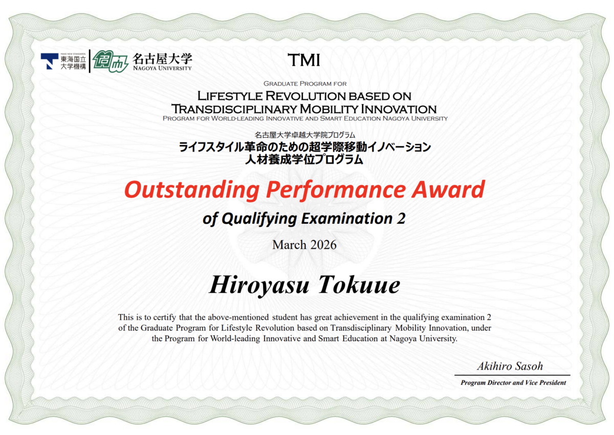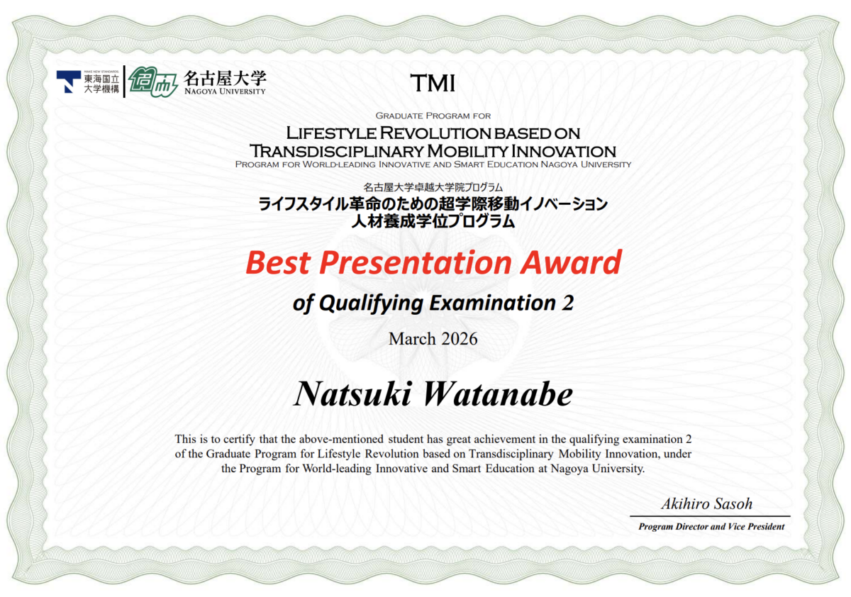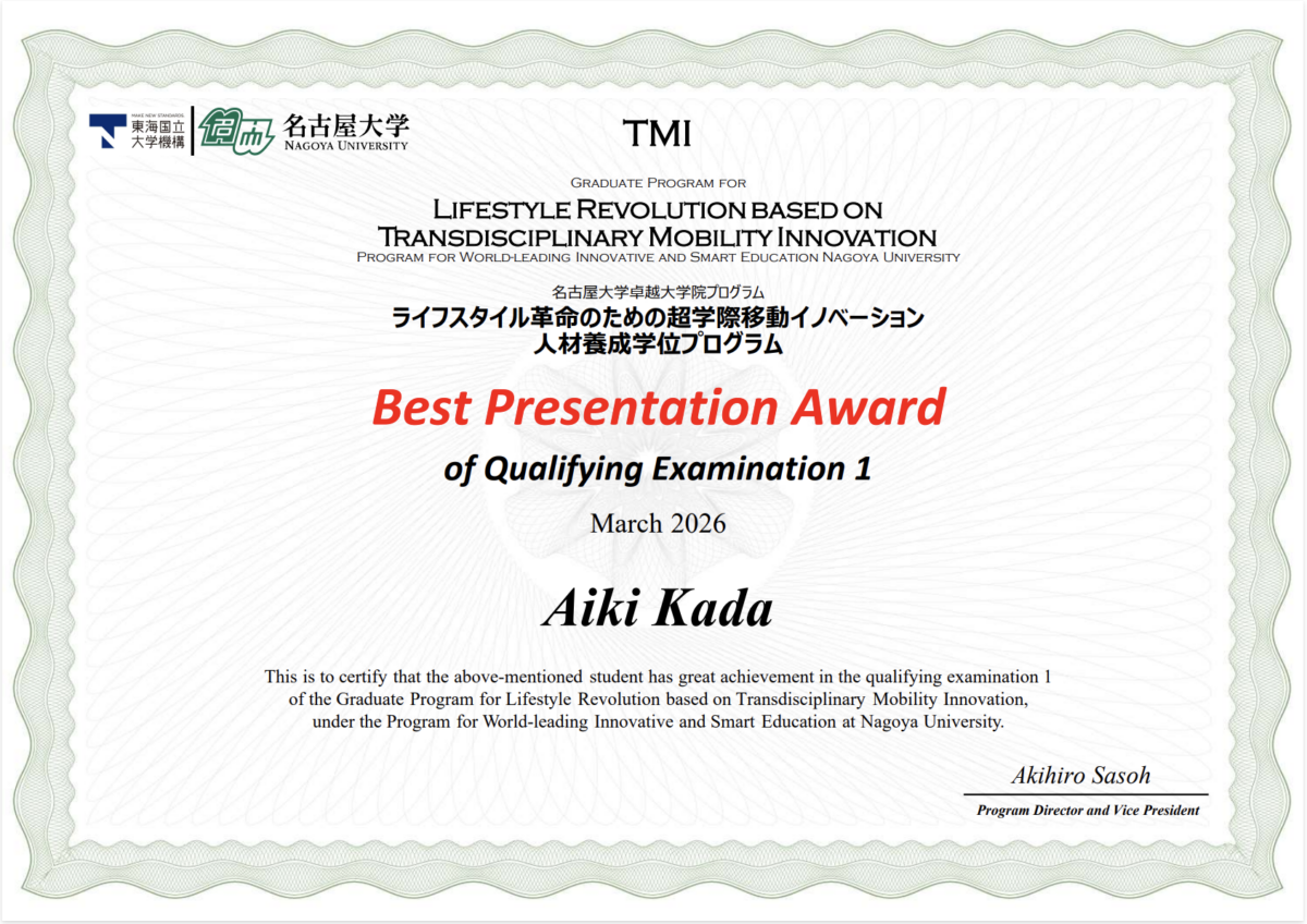 TMIプログラムでは、博士前期課程終了時にQE1、博士後期課程1年経過後にQE2を実施します。QE1とQE2では、指導教員及び他専攻・他研究科からの審査委員により、専門研究内容と学際的修得能力について包括評価し、優れた成果を上げた学生に対して最優秀賞と優秀賞を表彰します。