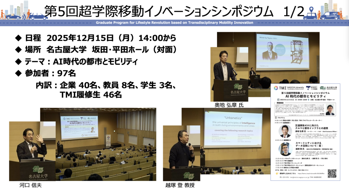 2025年12月15日(月)14:00~18:00、名古屋大学 坂田・平田ホールにて、「AI時代の都市とモビリティ」をテーマに、第5回超学際移動イノベーションシンポジウムを開催いたしました。
