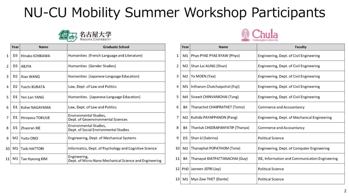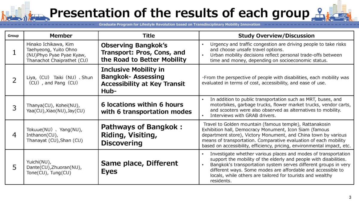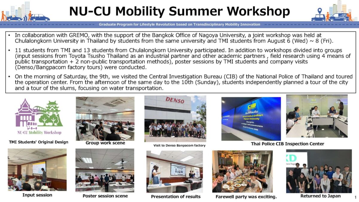 In collaboration with the Institute for Mobility Society (GREMO) of Nagoya University and with the support of the Bangkok Office of Nagoya University, a joint workshop was held at Chulalongkorn University in Thailand between students from Nagoya University and TMI students on August 6 (Wed) ~ 8 (Fri) 2025.